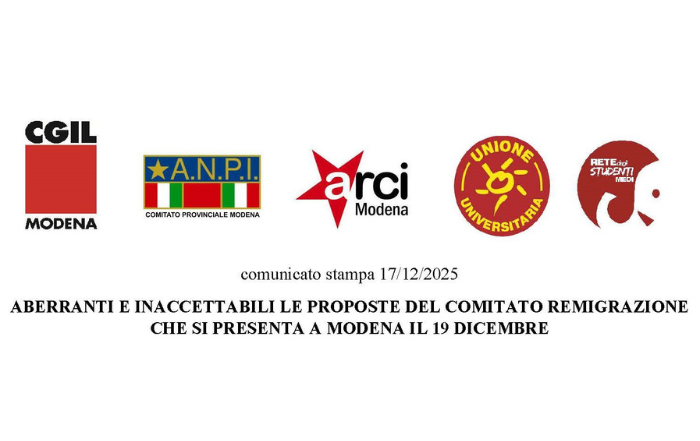 Cgil, Anpi e Arci, Udu e Rete Studenti Medi di Modena condannano fermamente l’iniziativa del Comitato Remigrazione che si terrà a Modena venerdì 19 dicembre. Sono previsti interventi di rappresentati del Fronte Veneto Skinheads, Rete dei Patrioti Emilia, Comunità militante Bulaggna e Casapound. Tutte organizzazioni di stampo chiaramente fascista e con forti posizioni razziste e xenofobe.