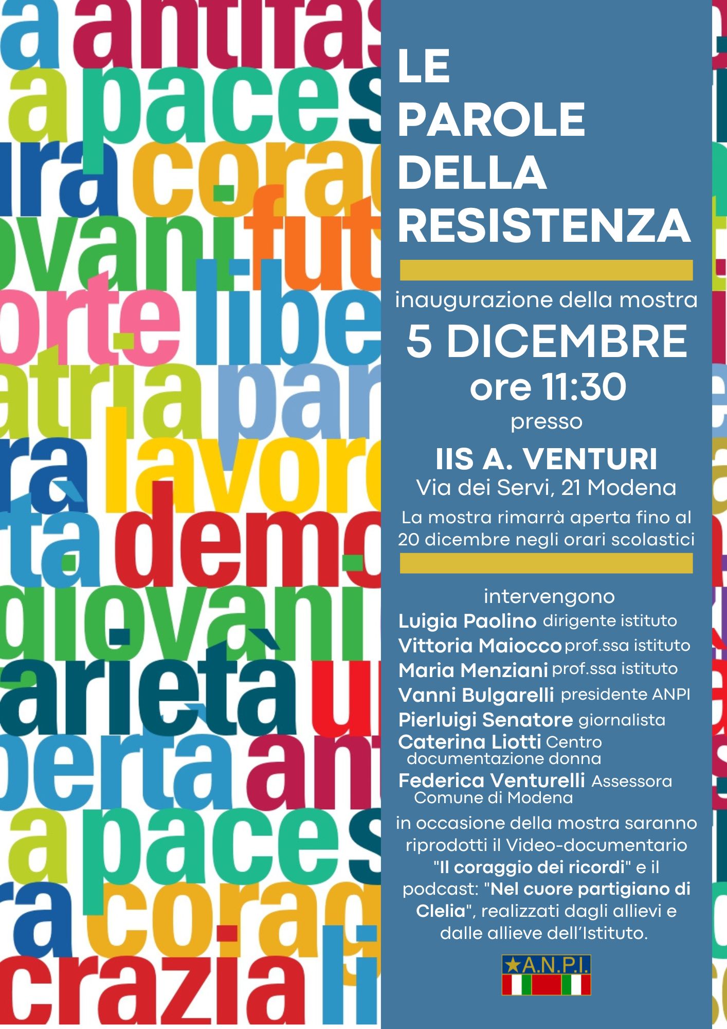 All’inaugurazione interverranno: Luigia Paolino, dirigente scolastico; le professoresse Vittoria Maiocco e Maria Menziani; Vanni Bulgarelli, presidente ANPI Modena; Pierluigi Senatore, giornalista; Caterina Liotti, del Centro documentazione donna; Federica Venturelli, assessora del Comune di Modena.